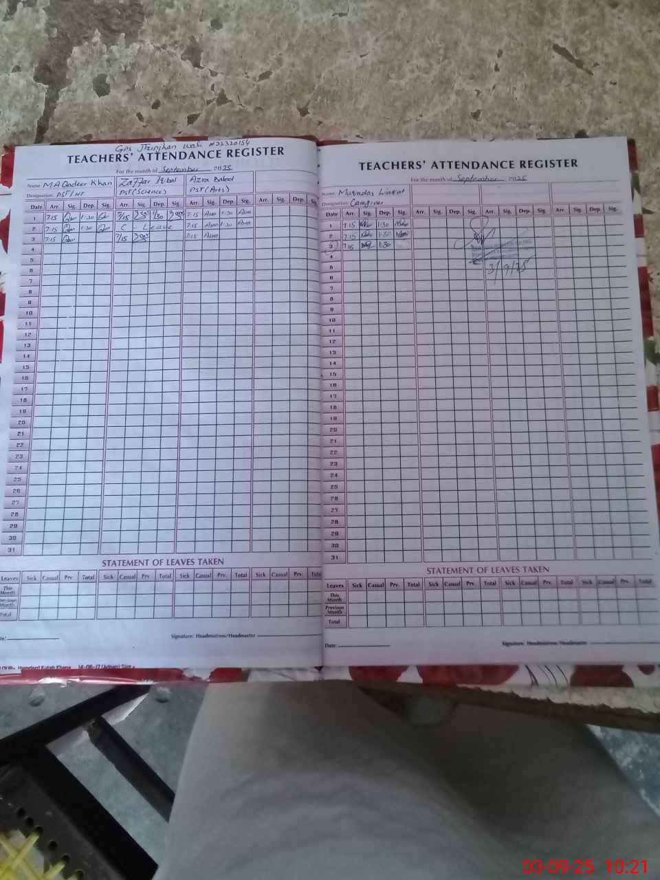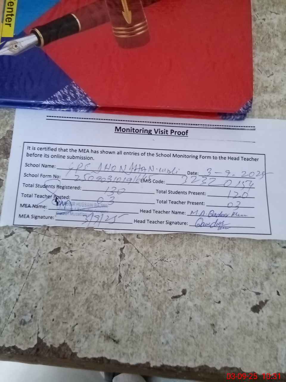 | Attendance Register | Head Teacher | MEA with School | Visit Proof |