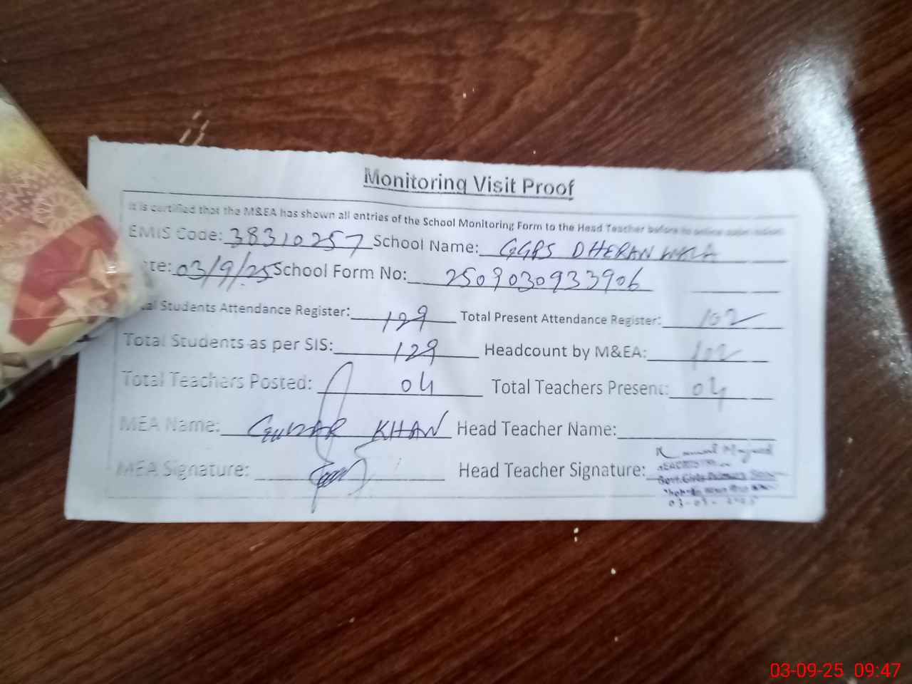 | EMIS Code: 38310257 | Name of School: GGPS DHERAN WALA | |||