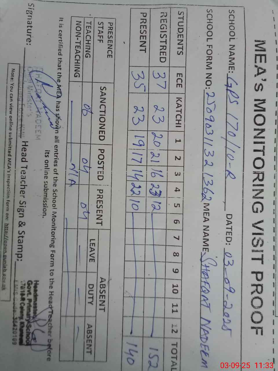 | Attendance Register | Head Teacher | MEA with School | Visit Proof |