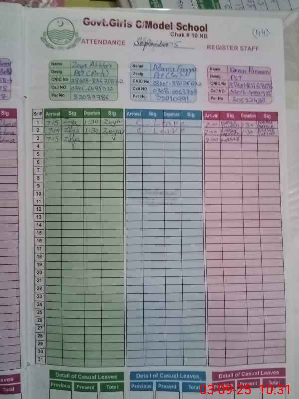| CNIC | Full Name | Designation | R/C | Absence During Last Calender Month |