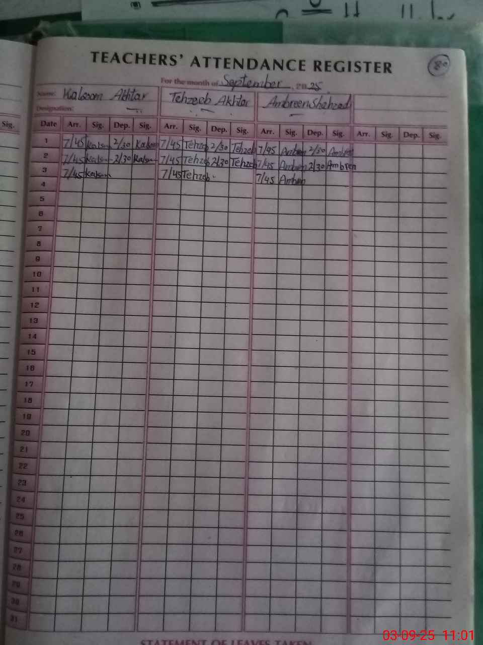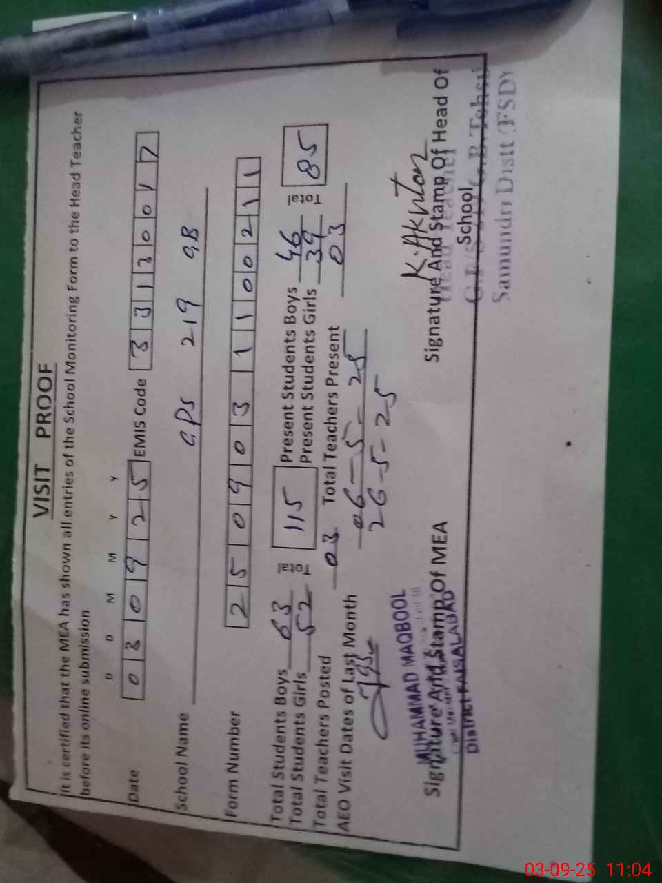 | Attendance Register | Head Teacher | MEA with School | Visit Proof |