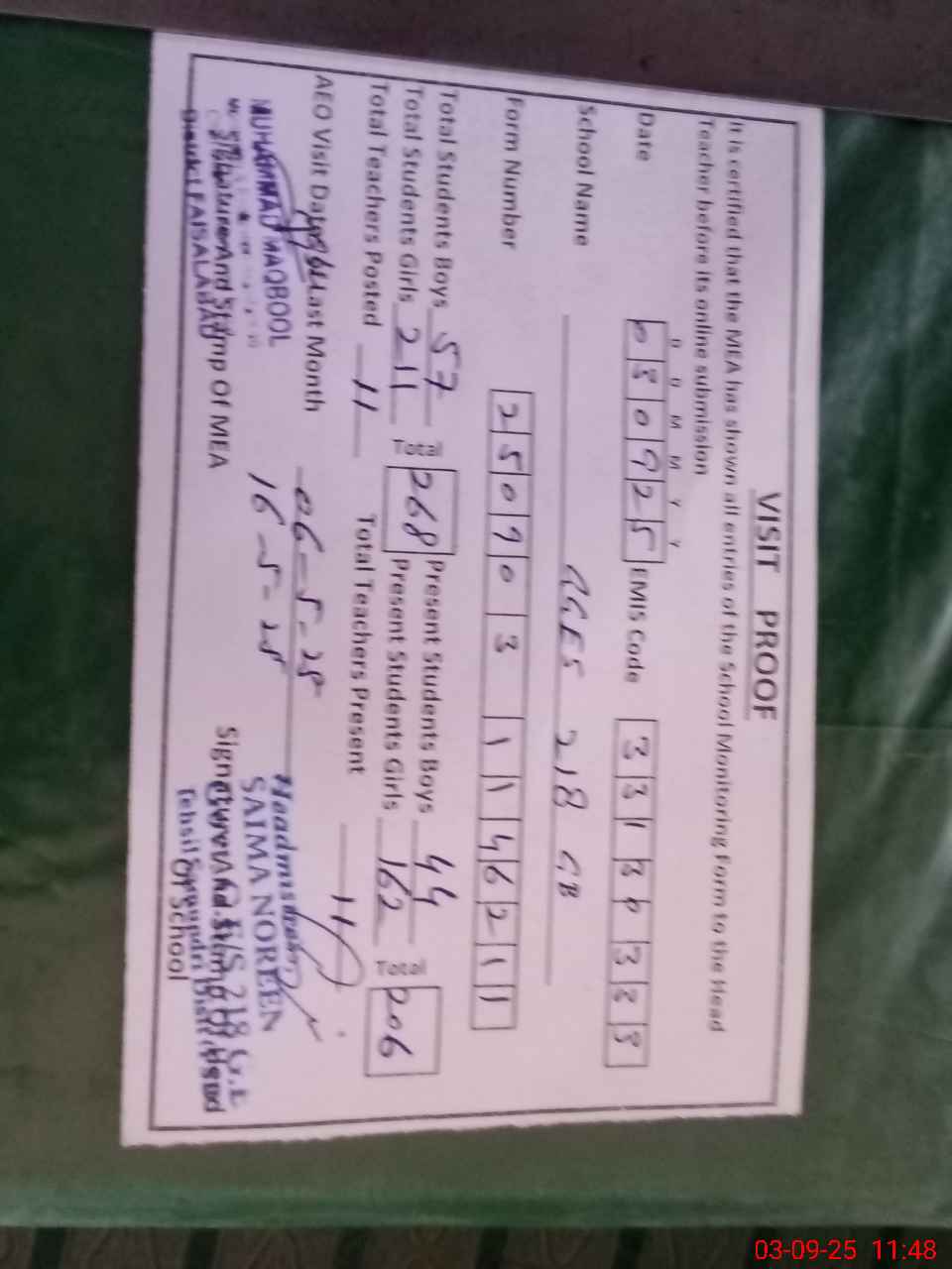 | Certified that this School was Inspected by the Undersigned MEA/DMO Today and the Information Stated Above is as Per Record. | |||||