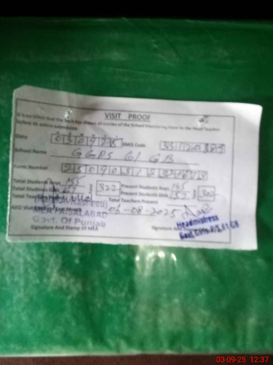| EMIS Code: 33120389 | Name of School: GGPS CHAK 61 GB JARANWALA | |||