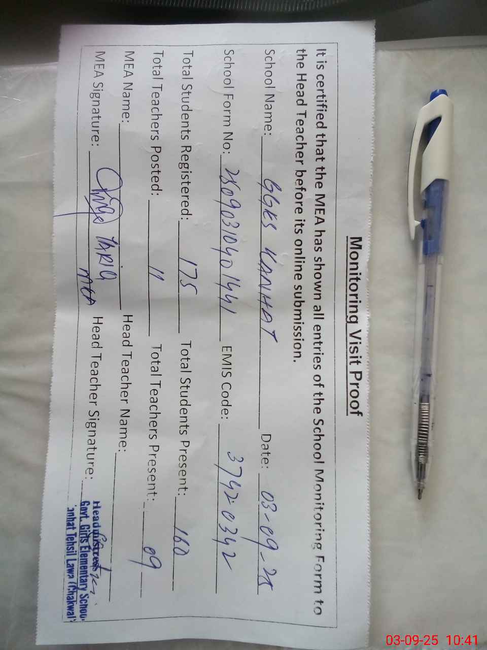 | Attendance Register | Head Teacher | MEA with School | Visit Proof |