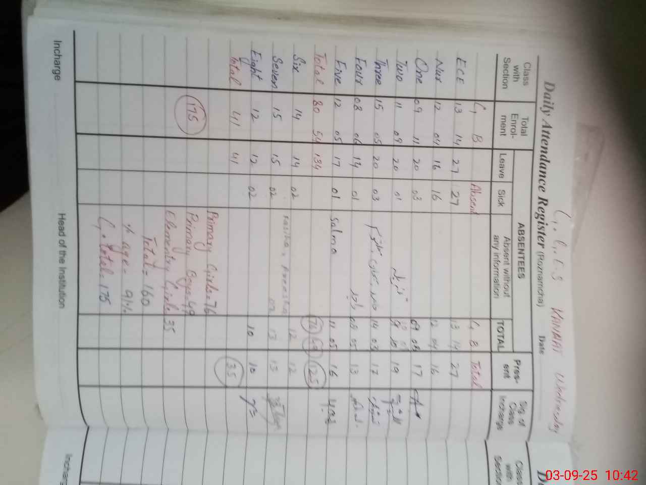 | No. of Students Present - Female | 13 | 0 | 12 | 9 | 10 | 14 | 8 | 11 | 12 | 13 | 10 | 112 | ||||