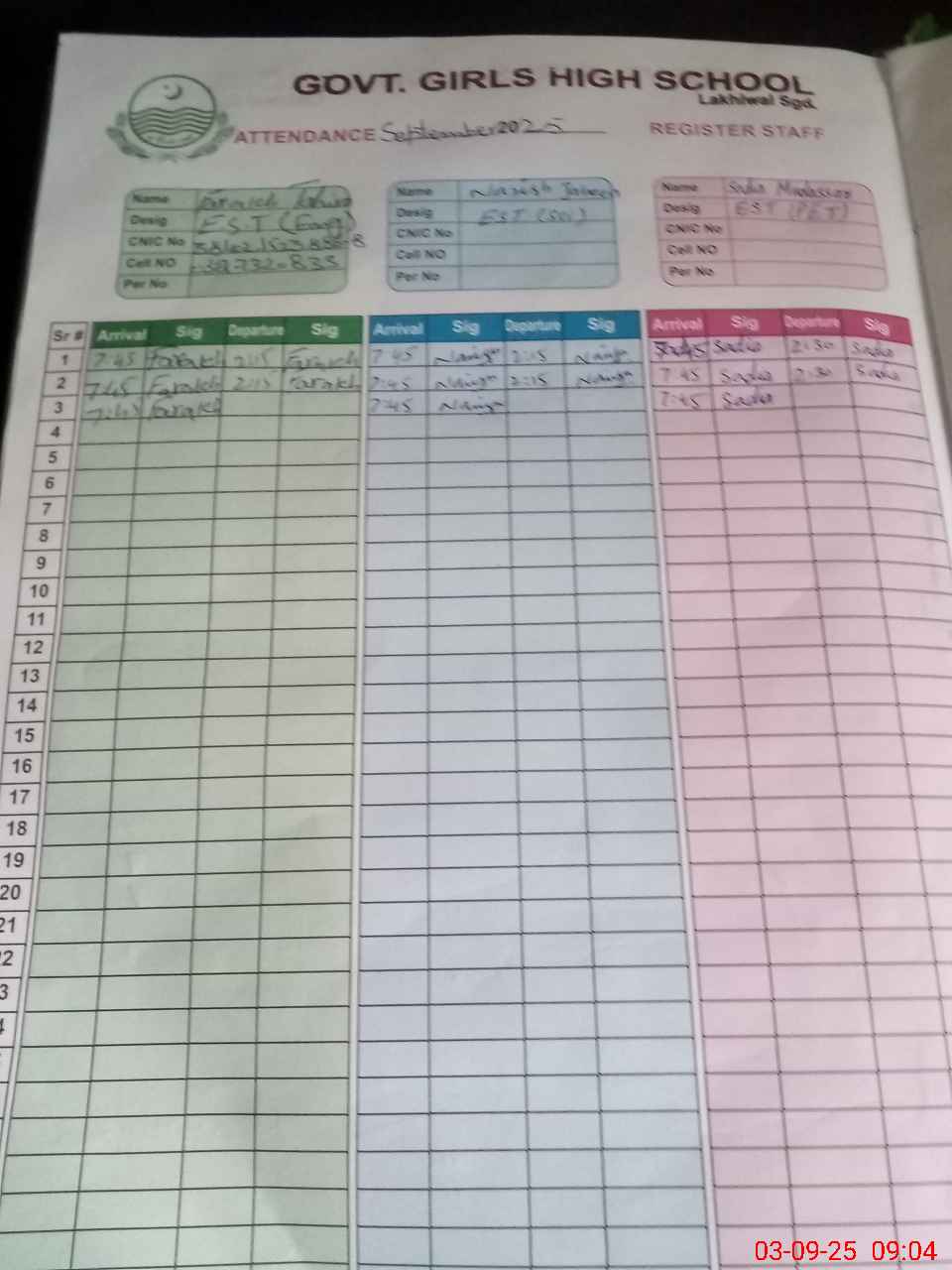 | CNIC | Full Name | Designation | R/C | Absence during last cal. month |