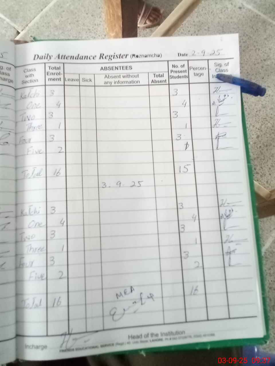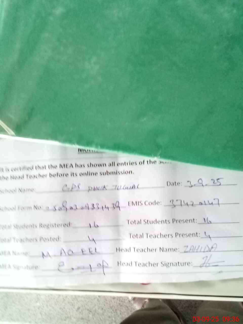 | Attendance Register | Head Teacher | MEA with School | Visit Proof |