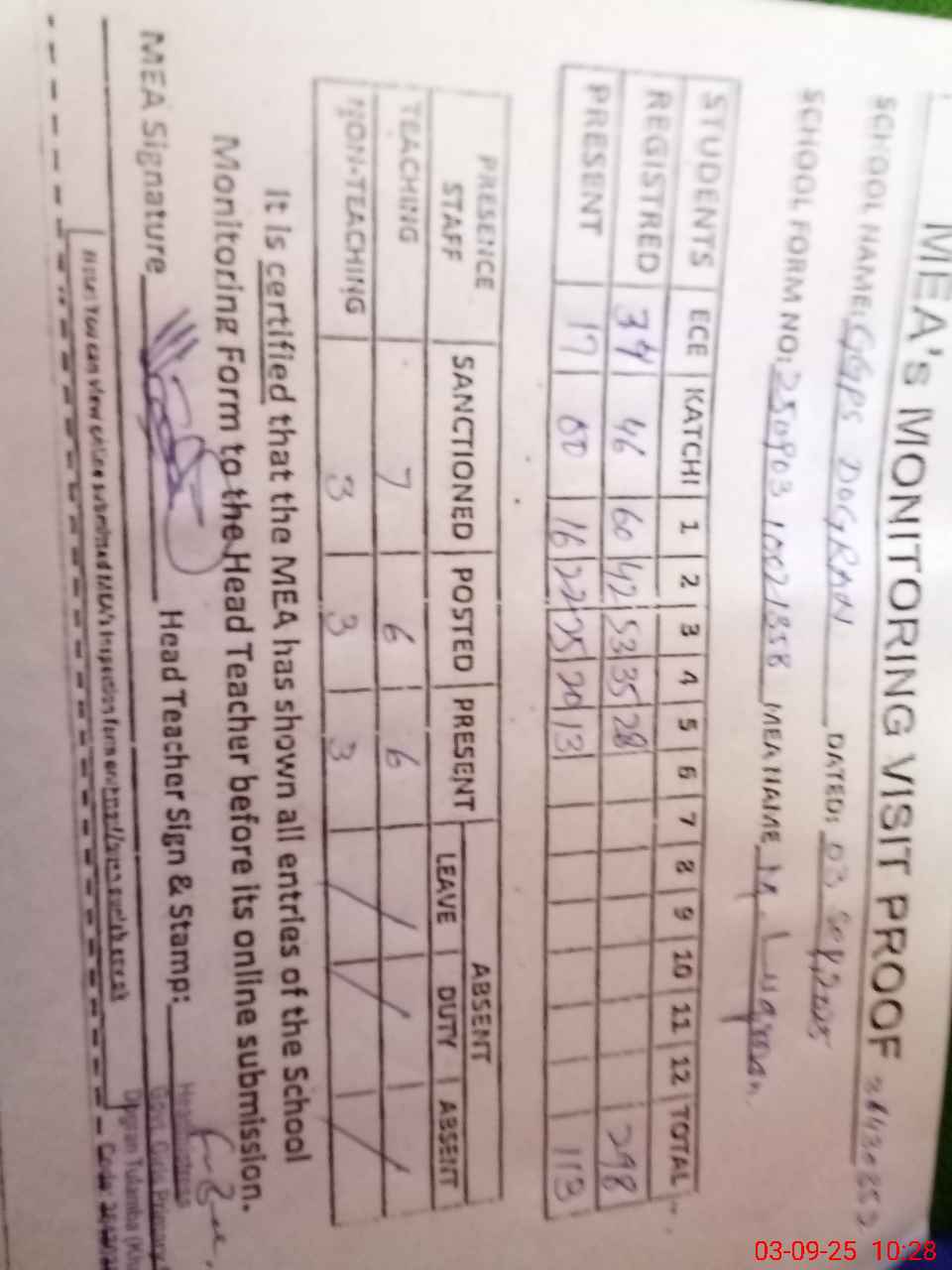 | Attendance Register | Head Teacher | MEA with School | Visit Proof |