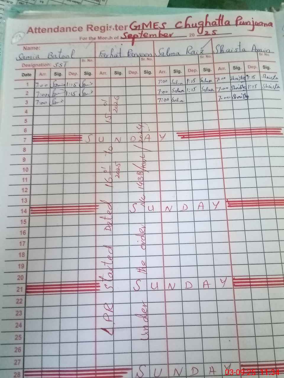 | CNIC | Full Name | Designation | R/C | Absence During Last Calender Month |