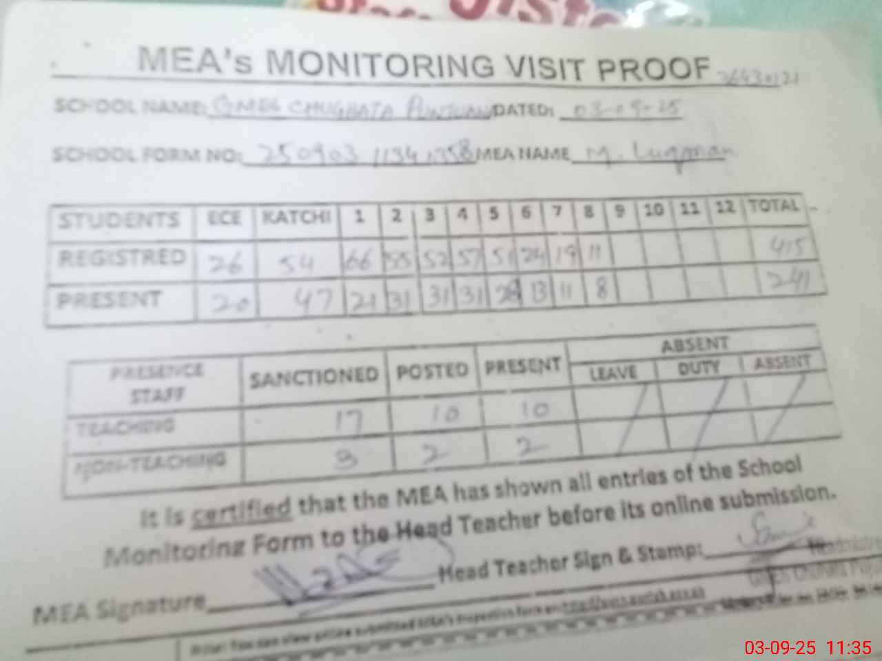 | Attendance Register | Head Teacher | MEA with School | Visit Proof |