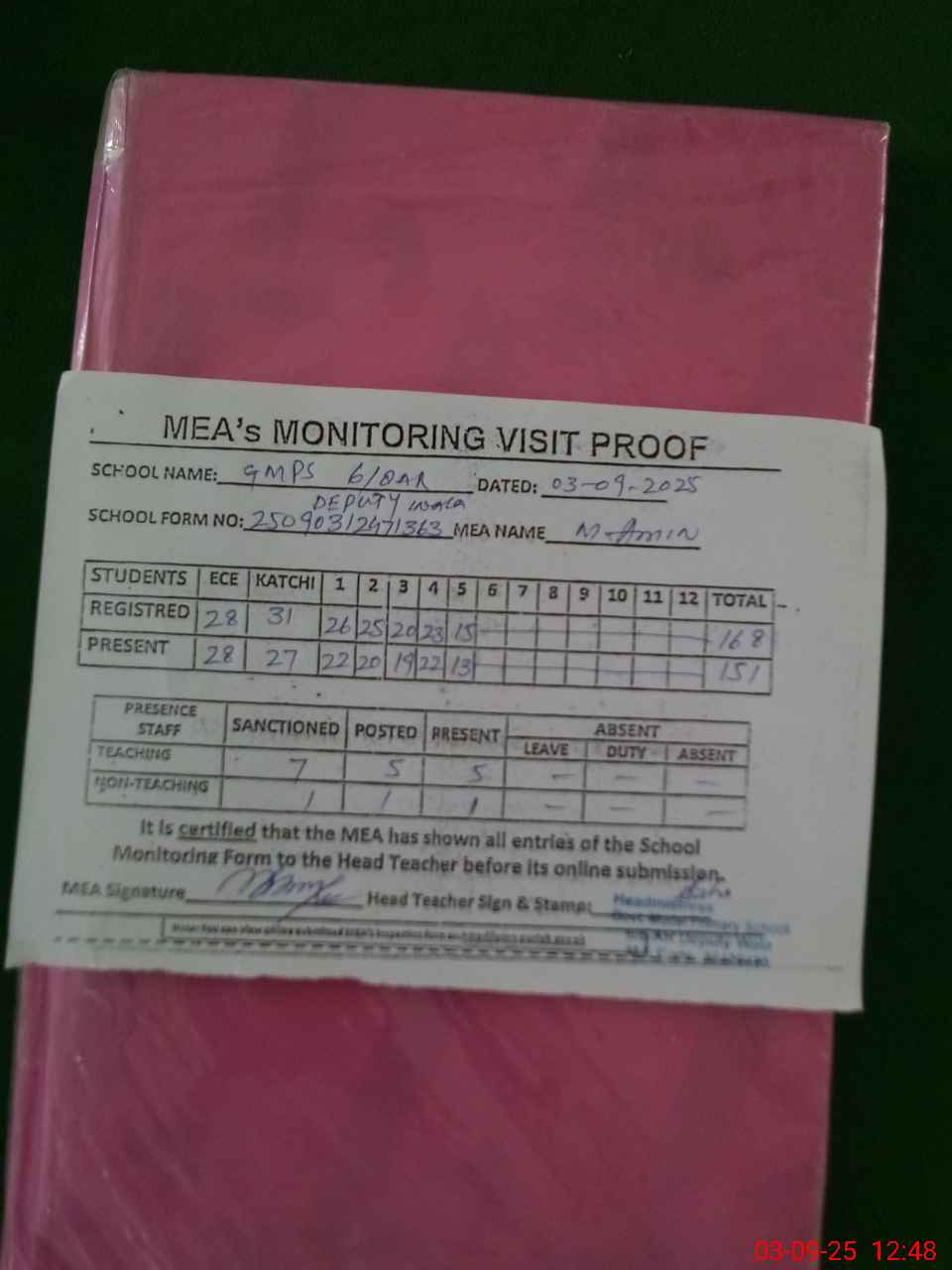 | Attendance Register | Head Teacher | MEA with School | Visit Proof |