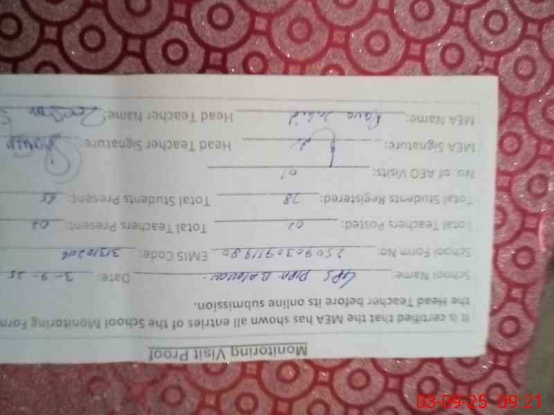 | Attendance Register | Head Teacher | MEA with School | Visit Proof |