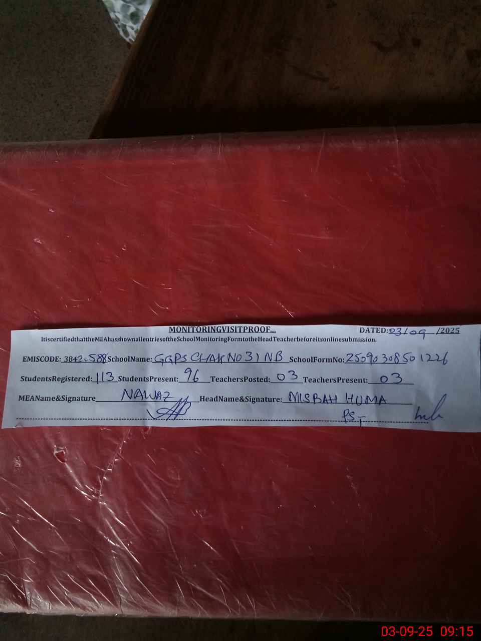 | Attendance Register | Head Teacher | MEA with School | Visit Proof |