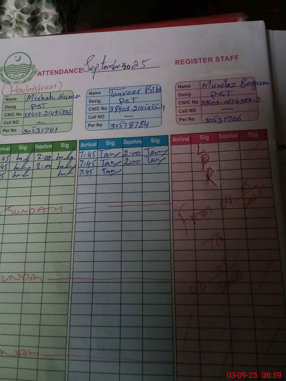 | CNIC | Full Name | Designation | R/C | Absence during last cal. month |