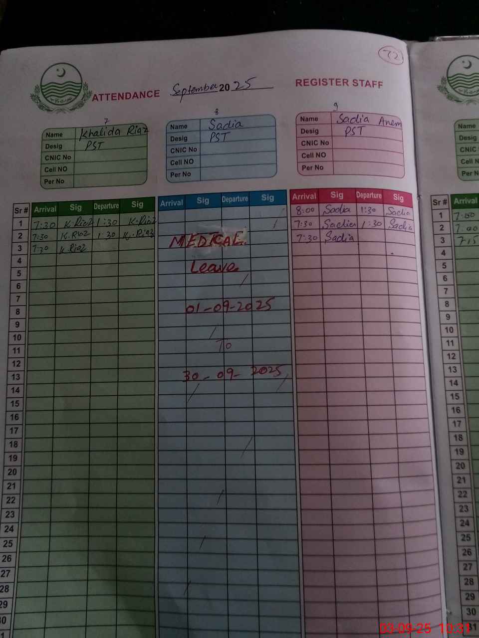 | CNIC | Full Name | Designation | R/C | Absence During Last Calender Month |