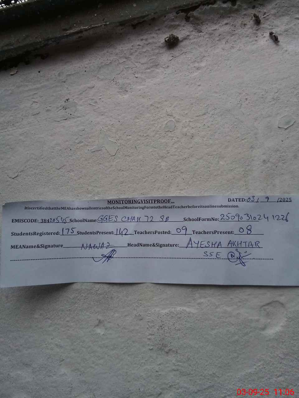 | Certified that this School was Inspected by the Undersigned MEA/DMO Today and the Information Stated Above is as Per Record. | |||||