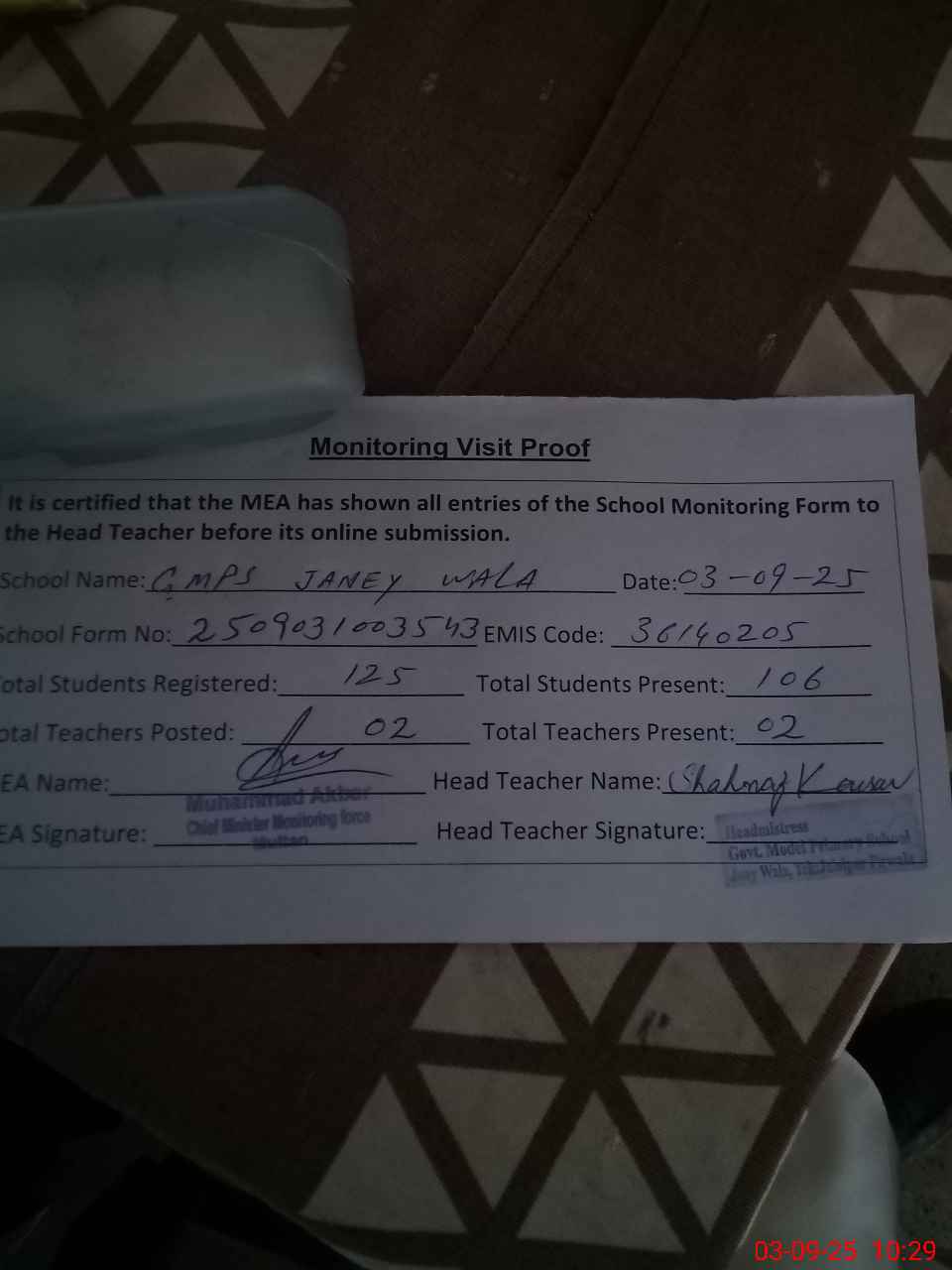| Attendance Register | Head Teacher | MEA with School | Visit Proof |