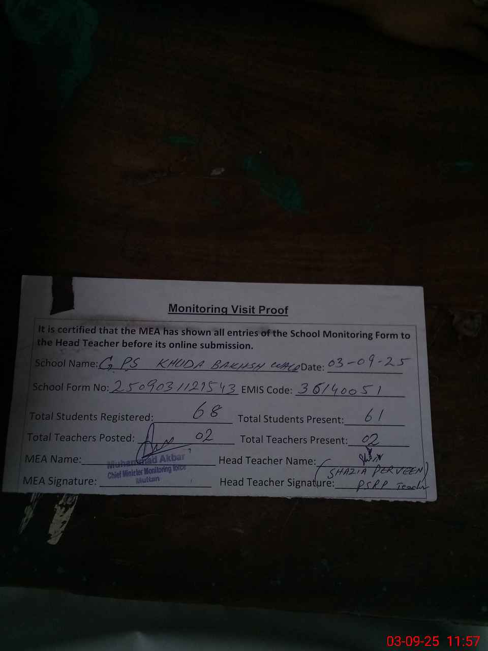 | Attendance Register | Head Teacher | MEA with School | Visit Proof |