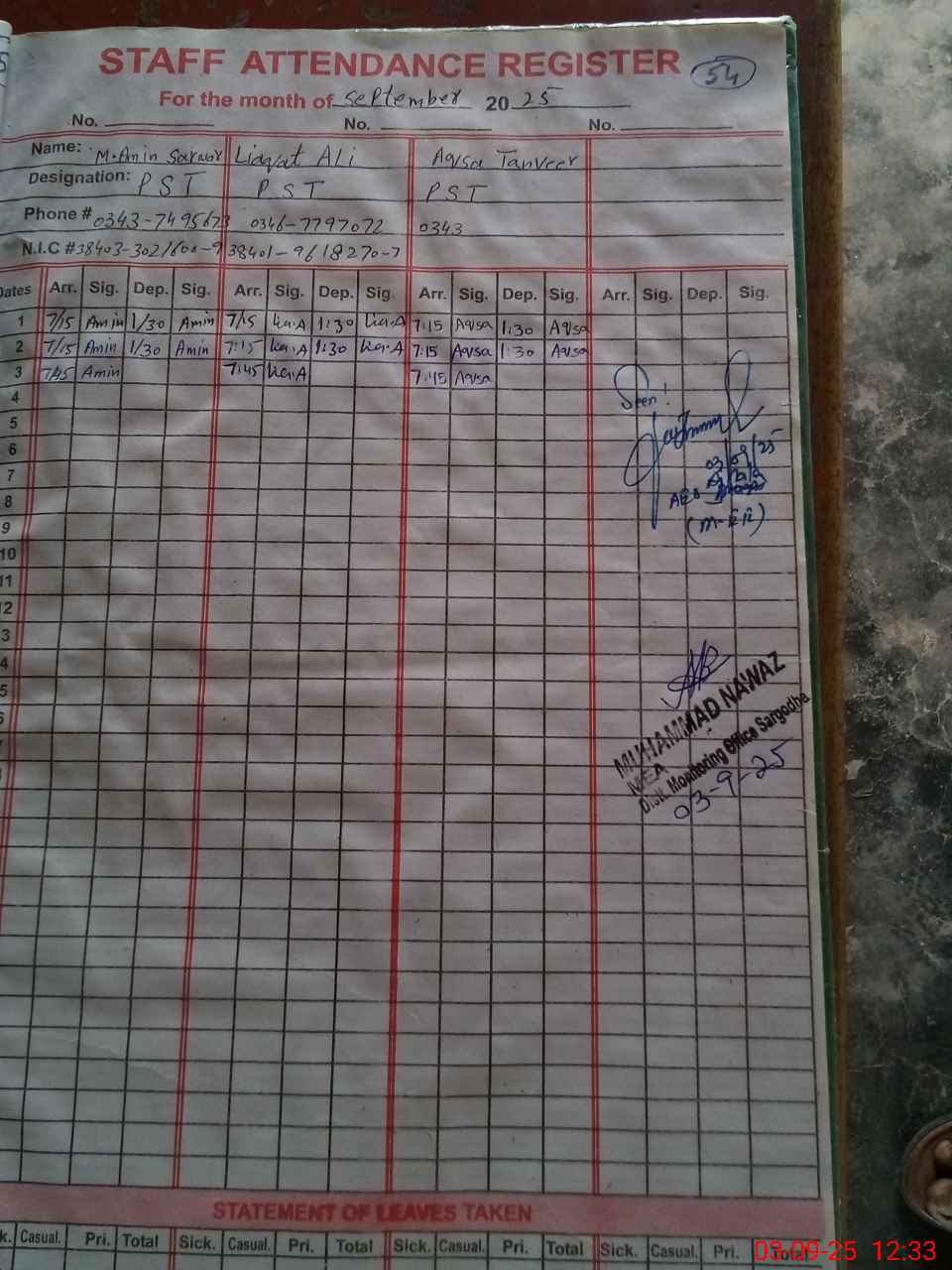 | CNIC | Full Name | Designation | R/C | Absence during last cal. month |