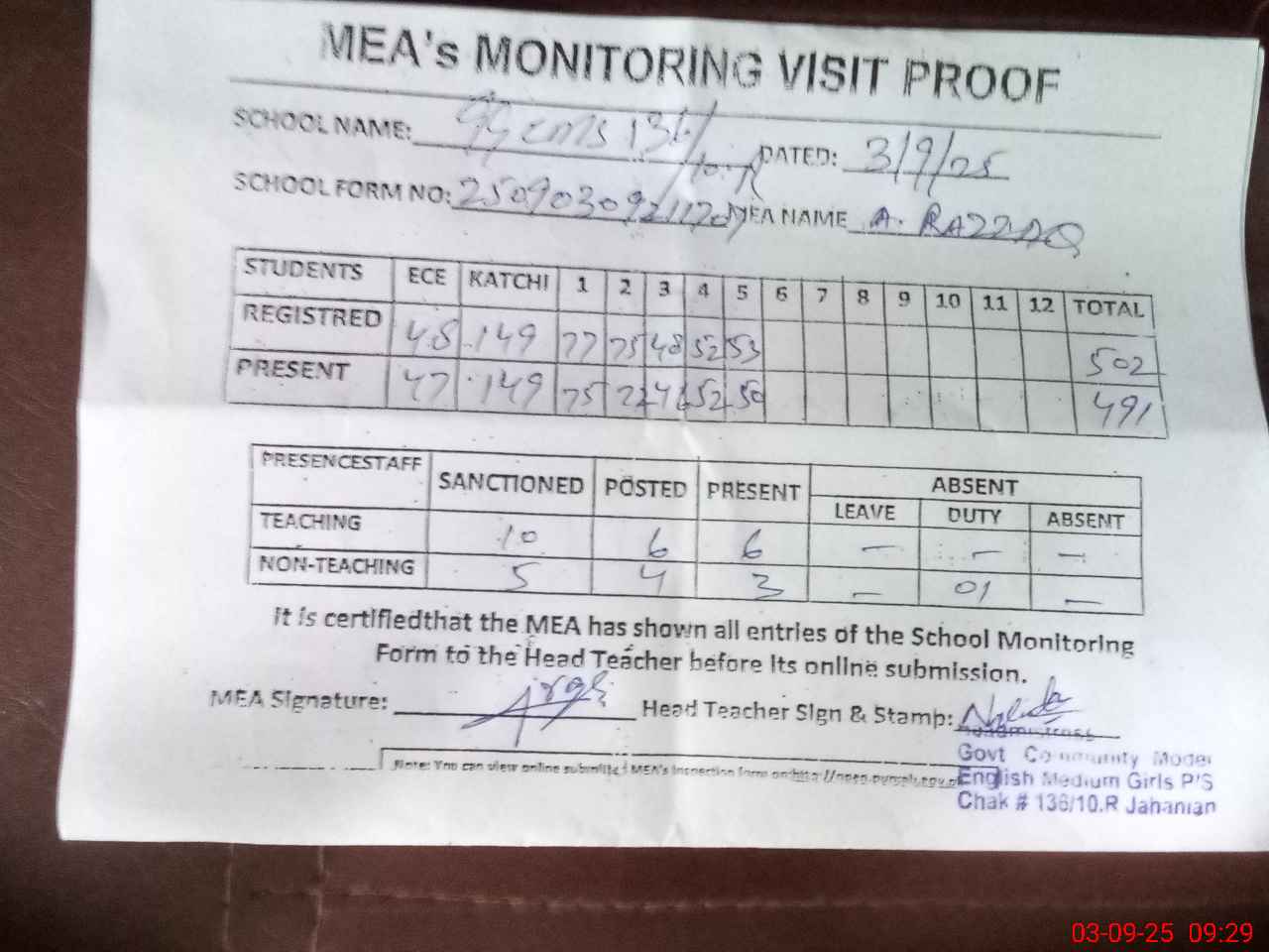 | Attendance Register | Head Teacher | MEA with School | Visit Proof |