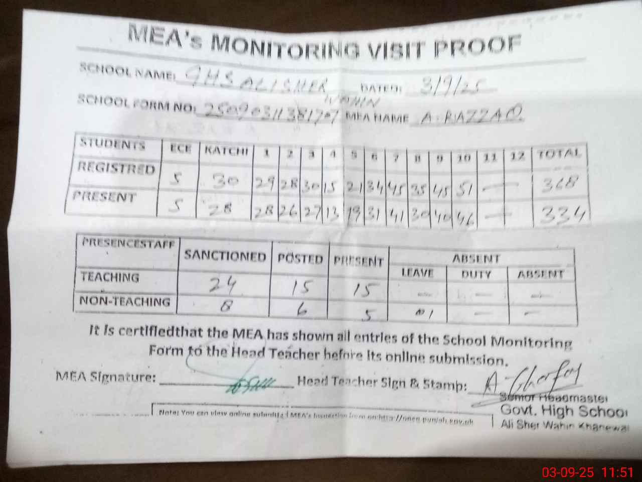 | EMIS Code: 36440033 | Name of School: GHS ALI SHER WAHIN, JAHANIAN | |||