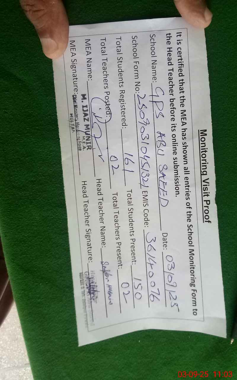 | EMIS Code: 36140076 | Name of School: GPS ABU SAEED P/O BAHADUR PUR ABO SAEED | |||