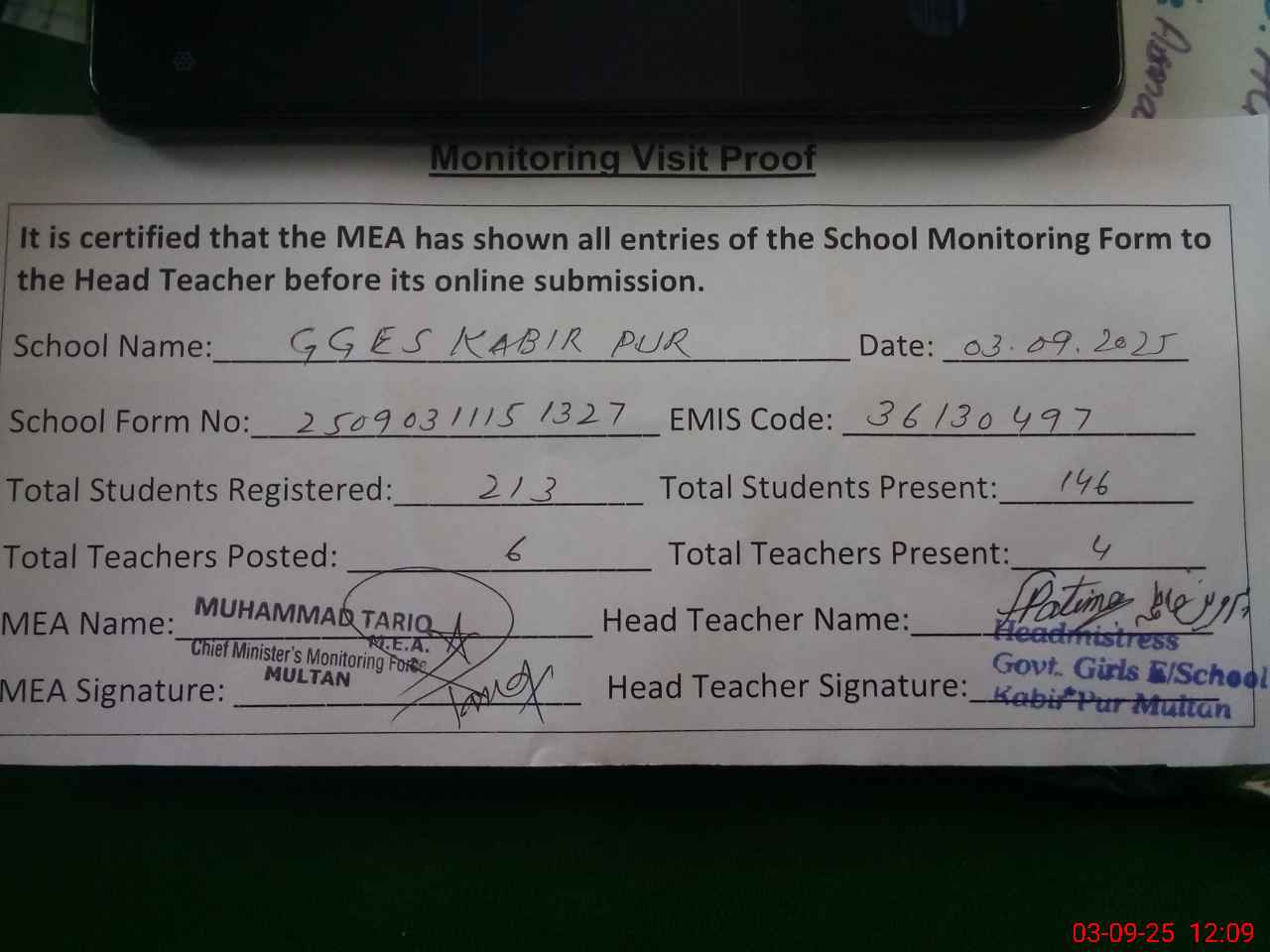 | Attendance Register | Head Teacher | MEA with School | Visit Proof |