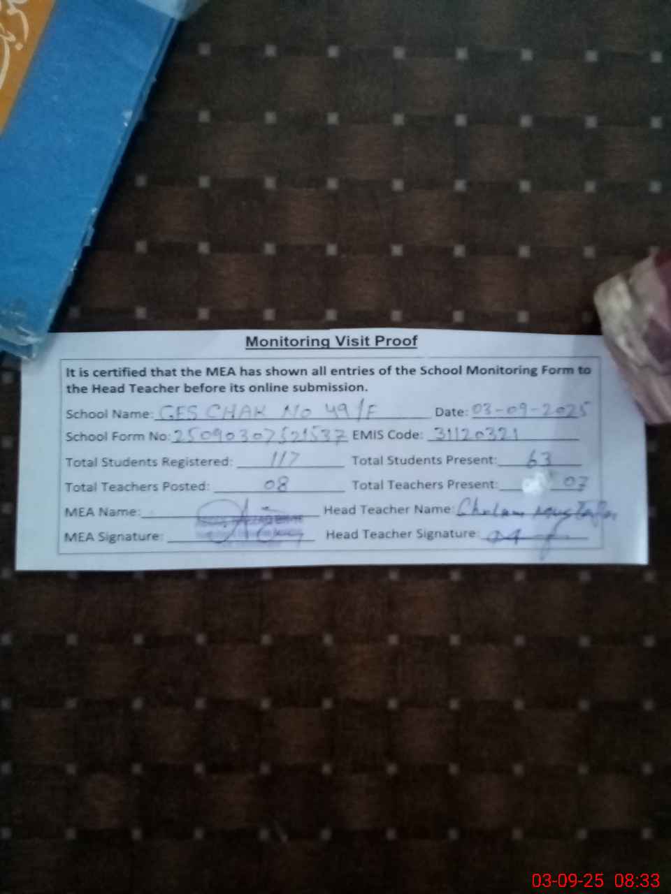| Attendance Register | Head Teacher | MEA with School | Visit Proof |