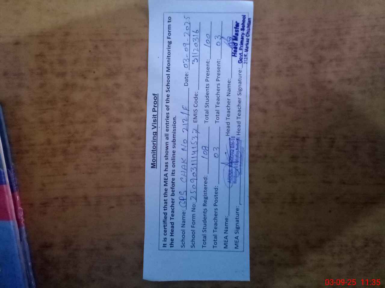| EMIS Code: 31120316 | Name of School: GPS CHAK NO 212/F | |||