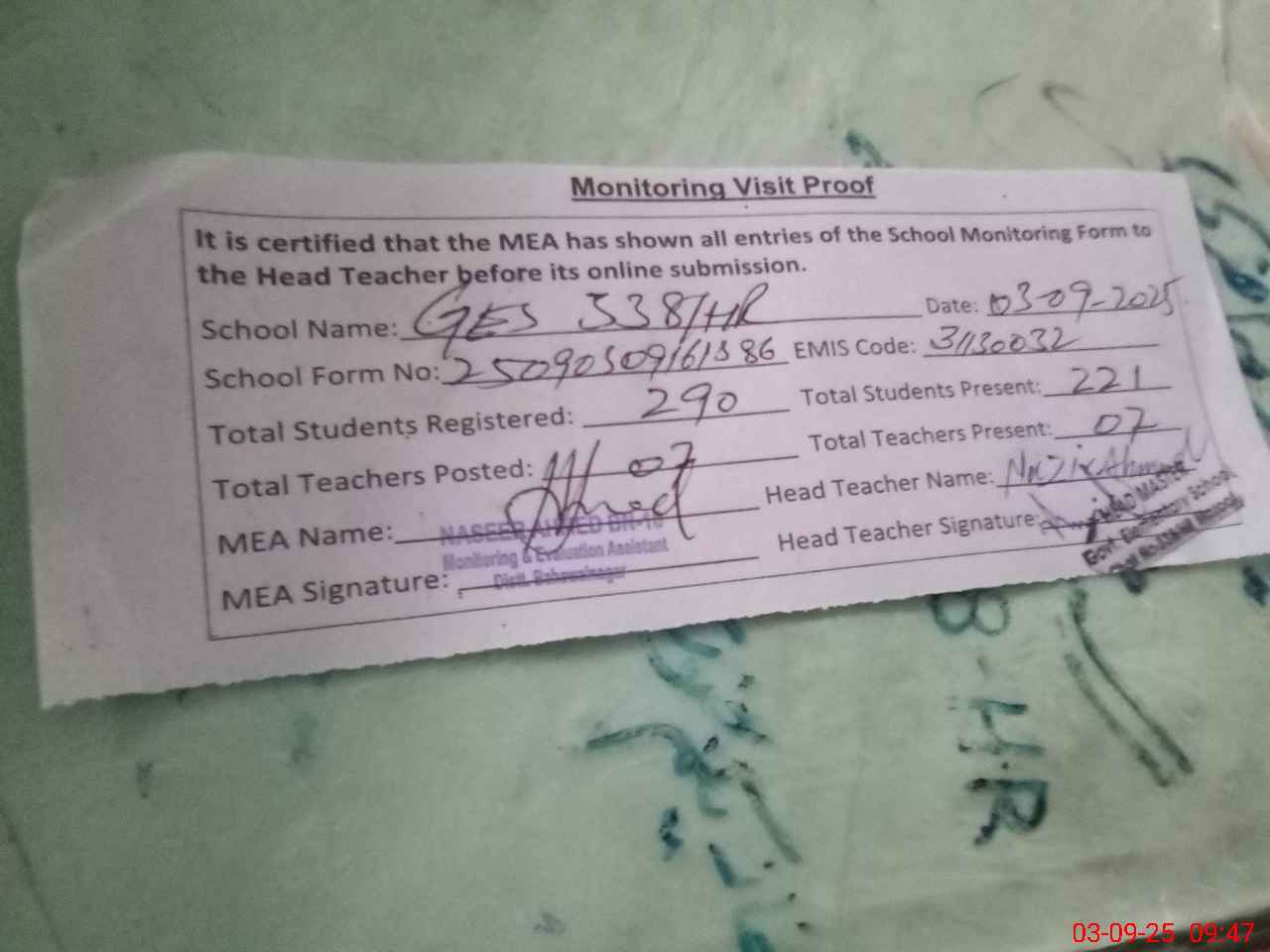 | Attendance Register | Head Teacher | MEA with School | Visit Proof |