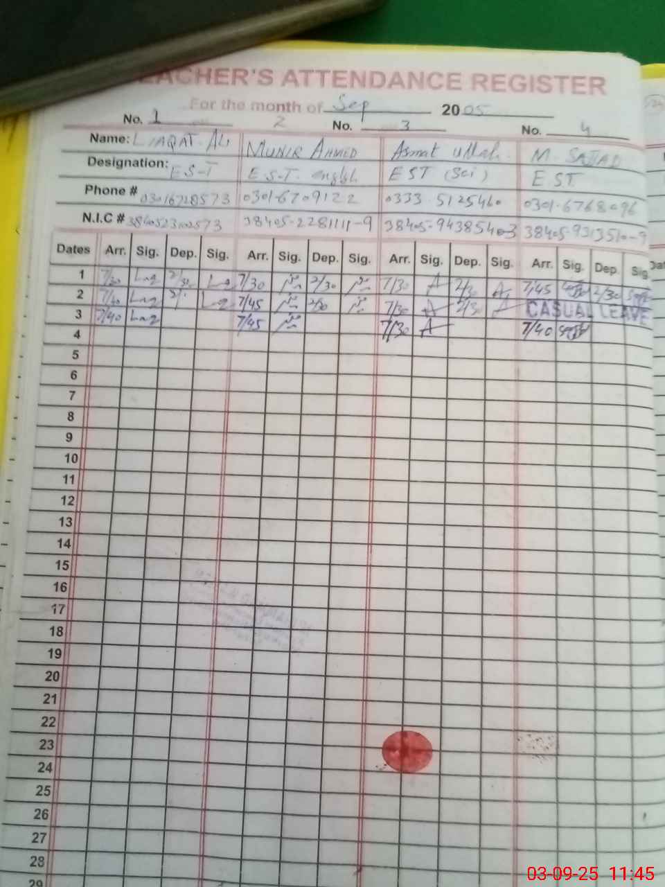 | CNIC | Full Name | Designation | R/C | Absence during last cal. month |