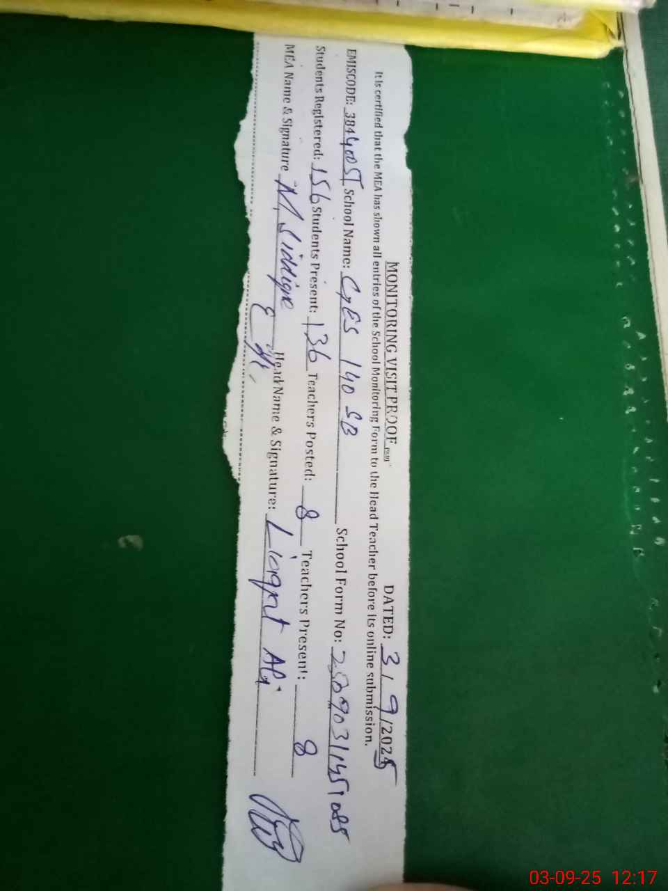 | Attendance Register | Head Teacher | MEA with School | Visit Proof |