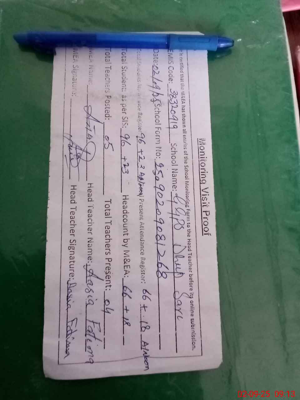 | Attendance Register | Head Teacher | MEA with School | Visit Proof |