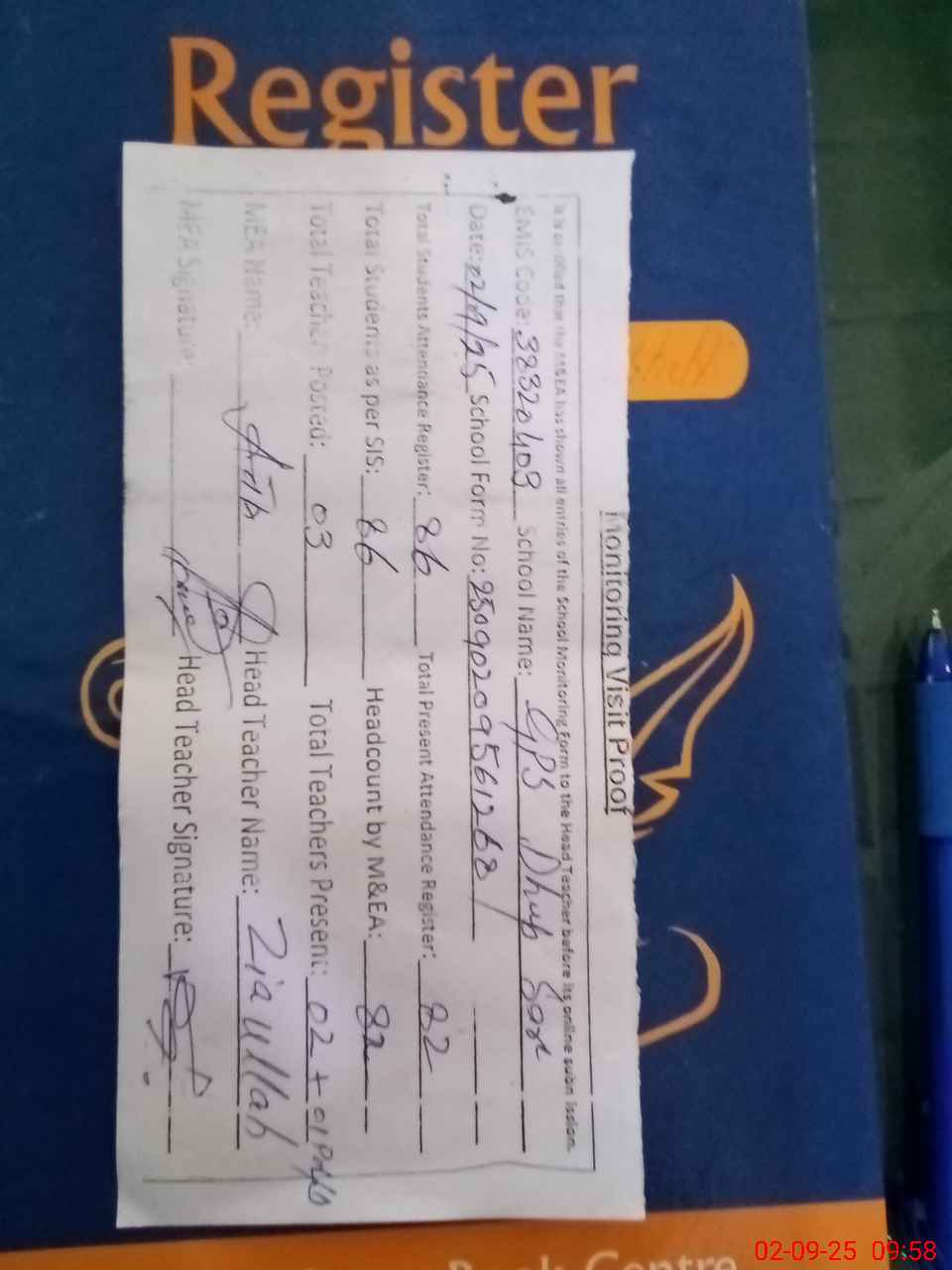 | Attendance Register | Head Teacher | MEA with School | Visit Proof |