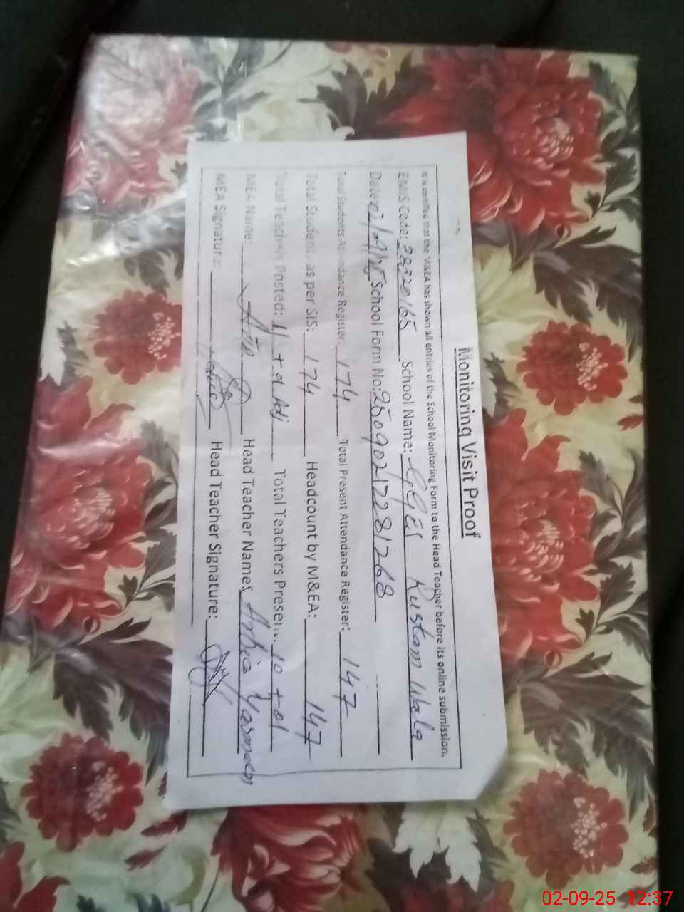 | Attendance Register | Head Teacher | MEA with School | Visit Proof |