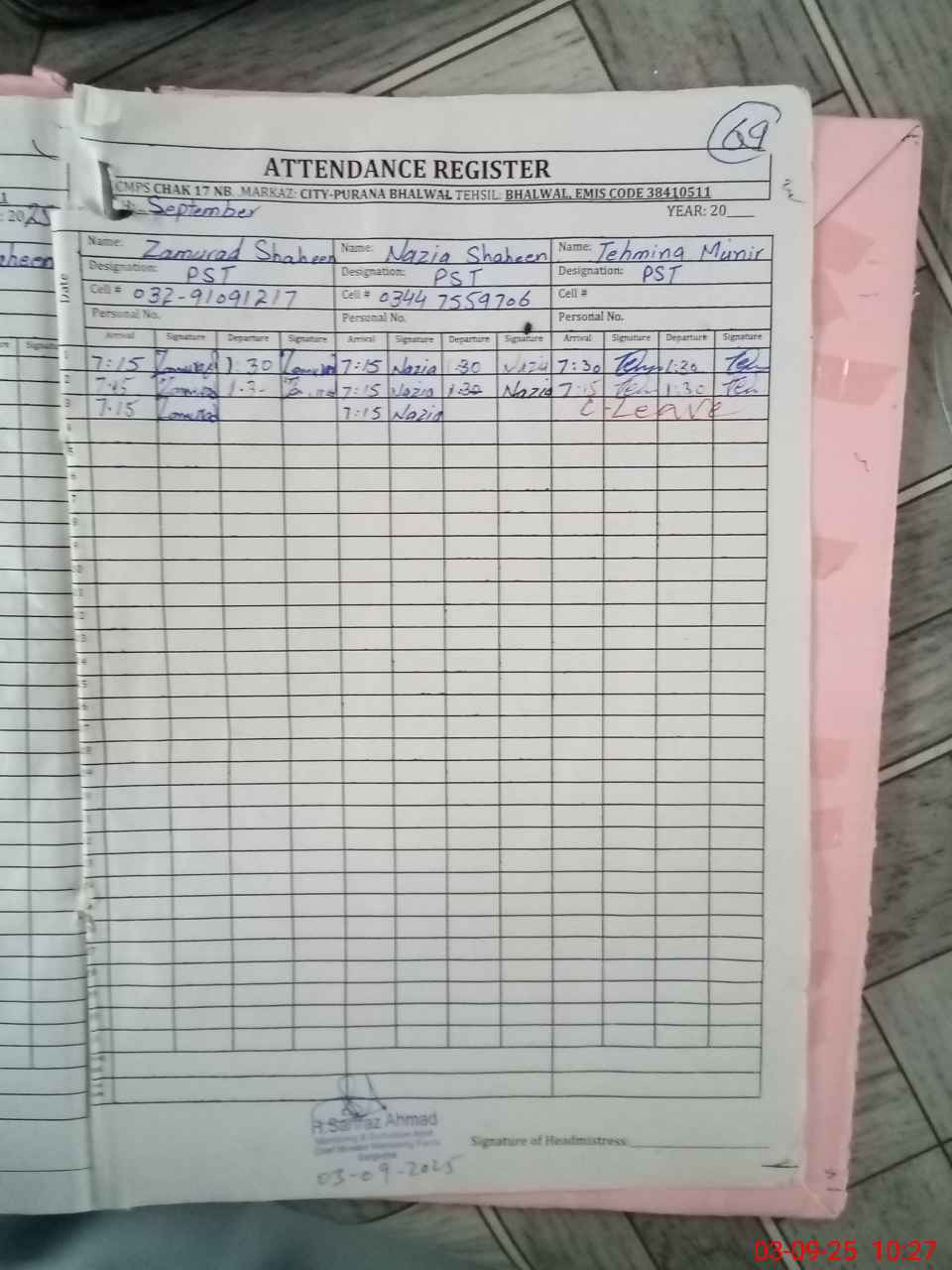 | Name: Za**** Sh**** Designation: (School Headmaster's/Headmistress's) PST Phone/Cell Number: 03**** |