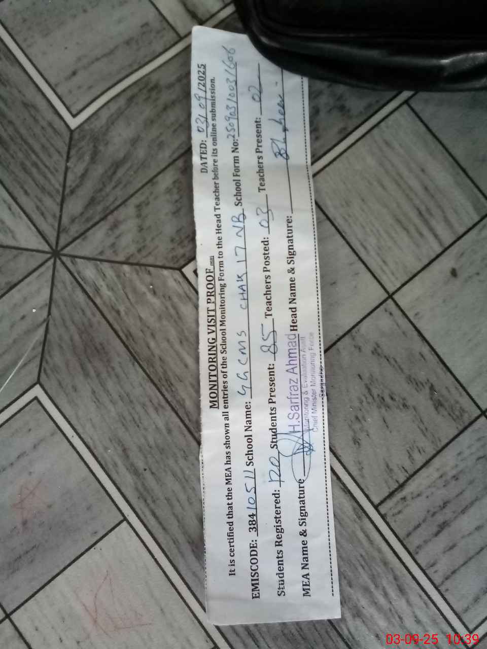 | Monitoring Date: 03-09-2025 | Start Time: 03-09-2025 10:03 AM | End Time: 03-09-2025 10:43 AM | Name of MEA: HA**** SA**** AH**** | |