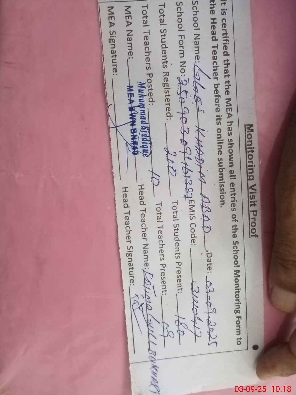 | Certified that this School was Inspected by the Undersigned MEA/DMO Today and the Information Stated Above is as Per Record. | |||||