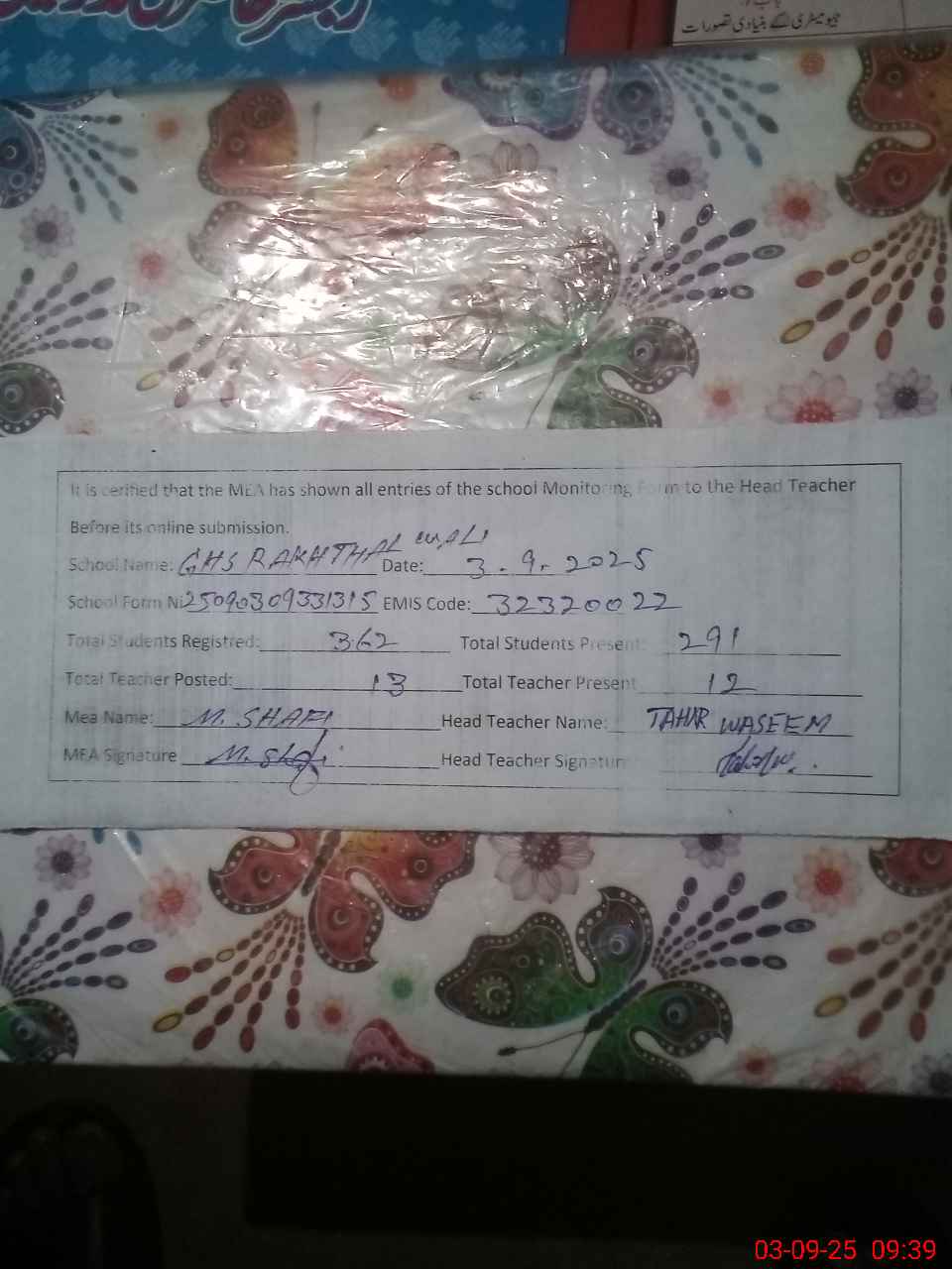 | Certified that this School was Inspected by the Undersigned MEA/DMO Today and the Information Stated Above is as Per Record. | |||||