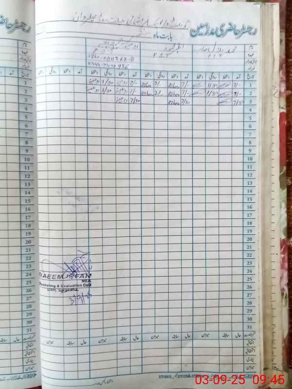 | Name: MU**** BI**** Designation: (School Headmaster's/Headmistress's) PST (SCI-MATH) Phone/Cell Number: 03**** |