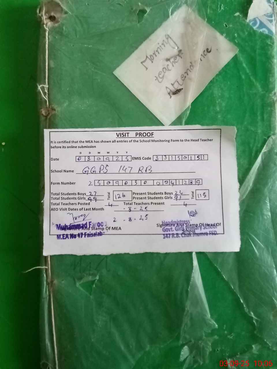 | Attendance Register | Head Teacher | MEA with School | Visit Proof |