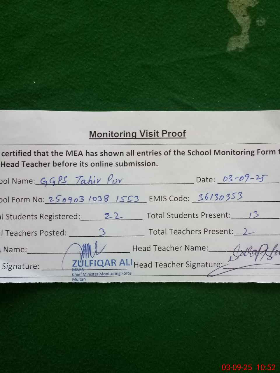 | Attendance Register | Head Teacher | MEA with School | Visit Proof |
