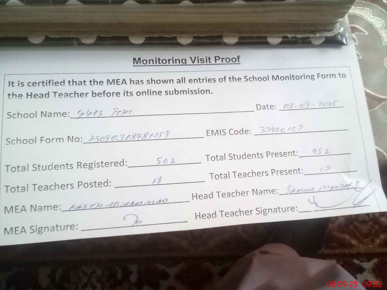 | Attendance Register | Head Teacher | MEA with School | Visit Proof |
