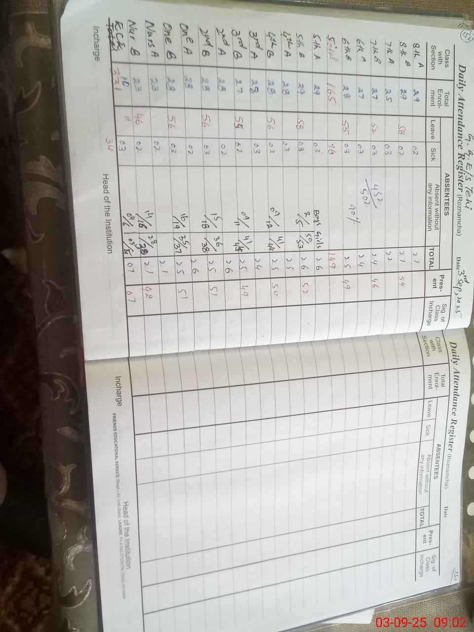 | No. of Students Present - Female | 3 | 0 | 28 | 35 | 36 | 41 | 41 | 50 | 49 | 46 | 54 | 383 | ||||