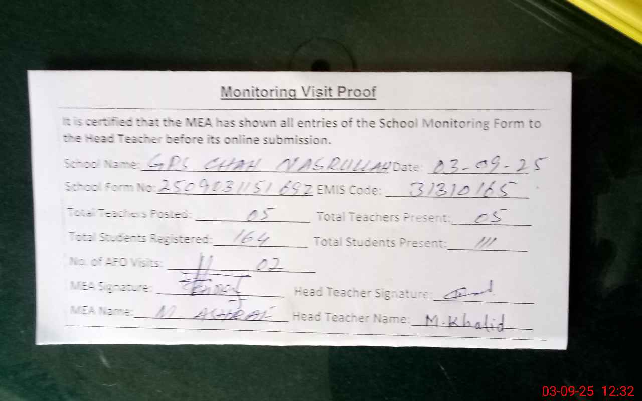 | EMIS Code: 31310165 | Name of School: GPS CHAH NASRULLAH | |||