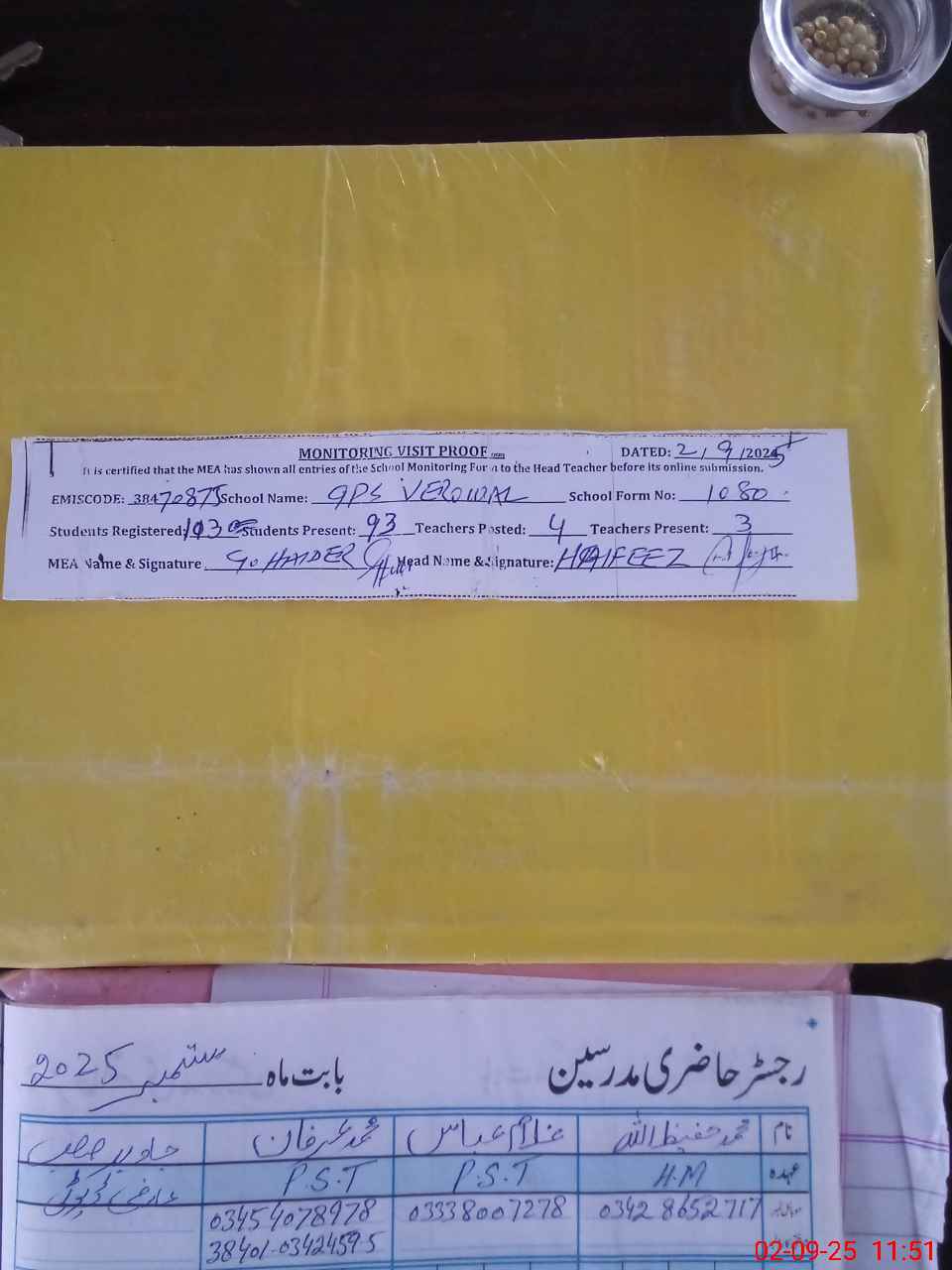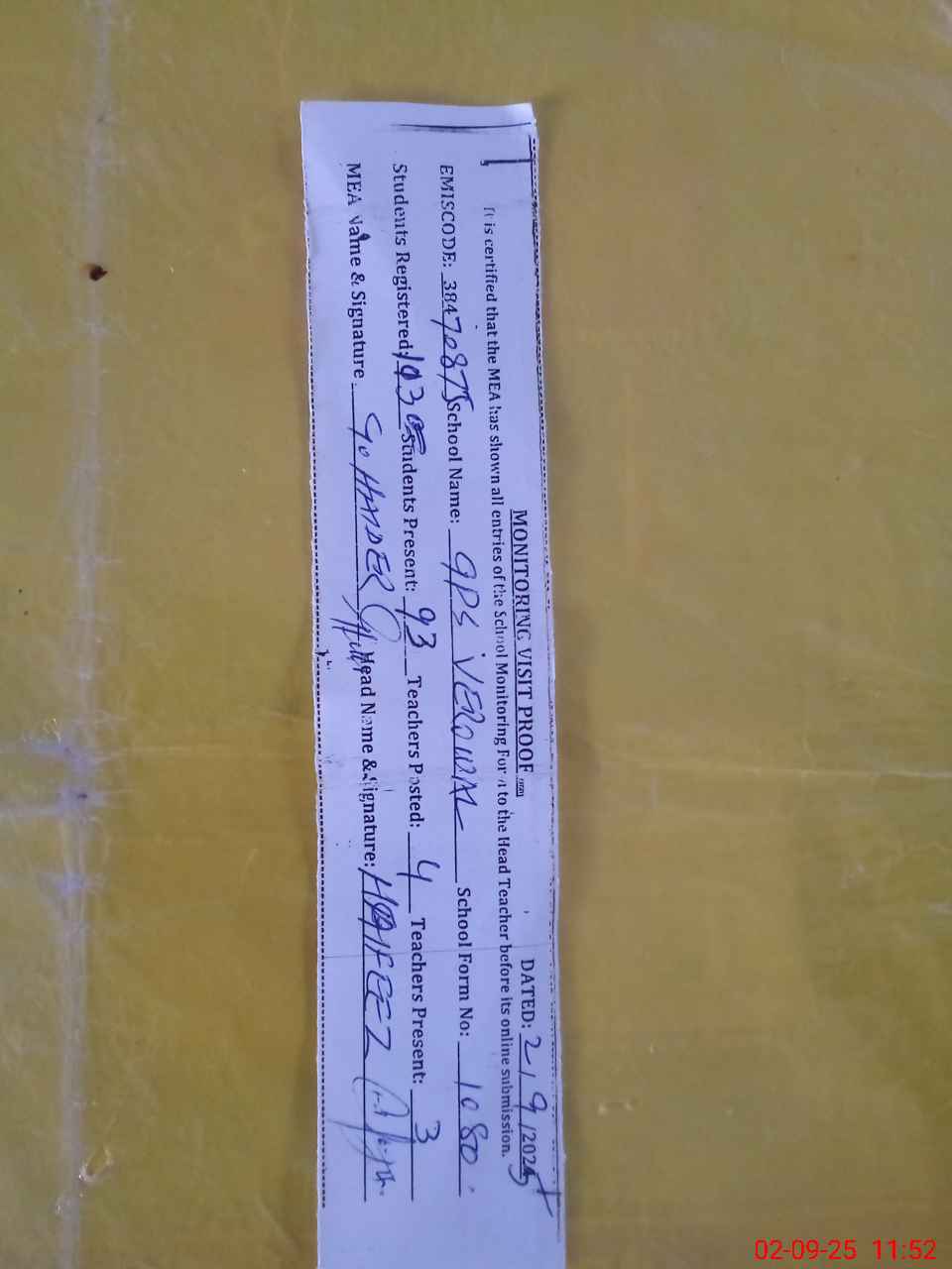 | Attendance Register | Head Teacher | MEA with School | Visit Proof |