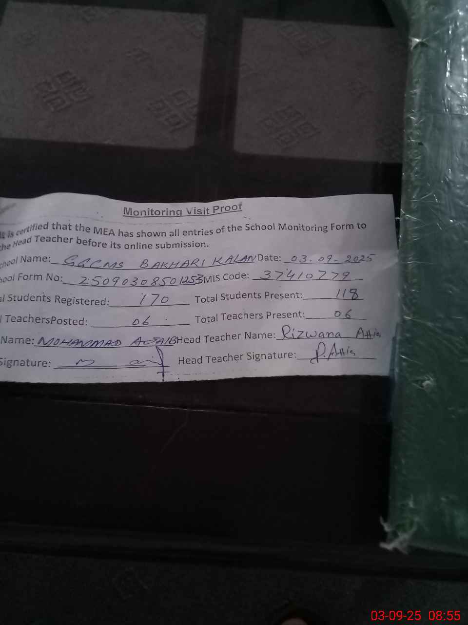 | Attendance Register | Head Teacher | MEA with School | Visit Proof |