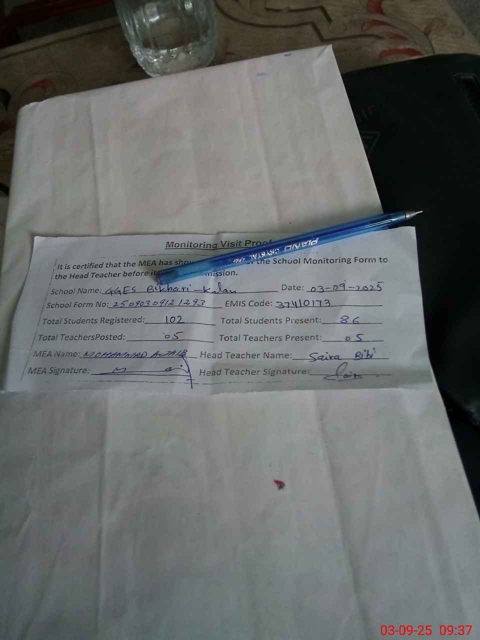 | Attendance Register | Head Teacher | MEA with School | Visit Proof |