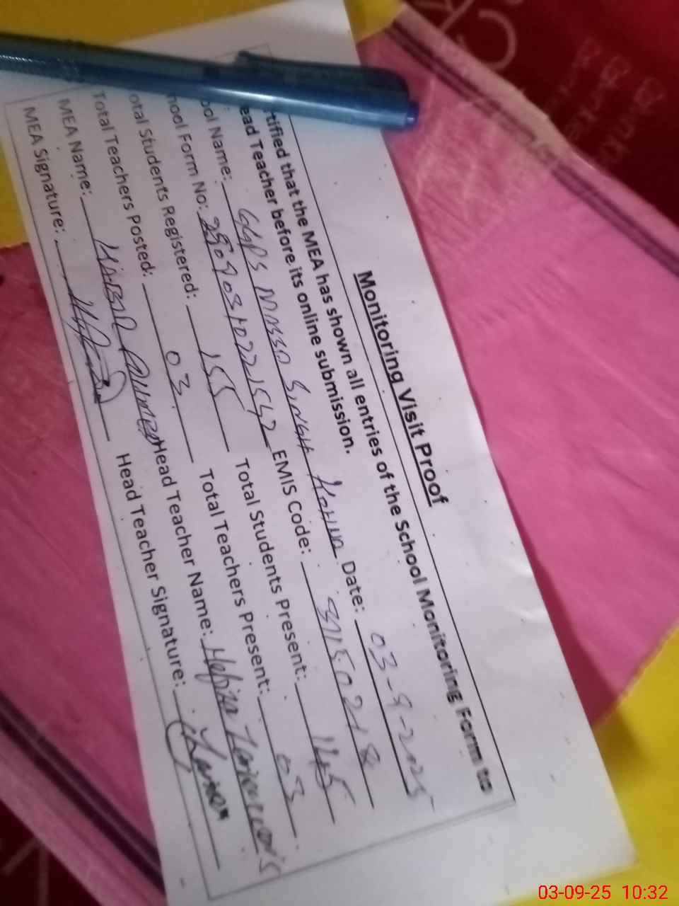 | Attendance Register | Head Teacher | MEA with School | Visit Proof |