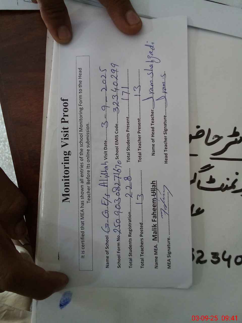| Attendance Register | Head Teacher | MEA with School | Visit Proof |